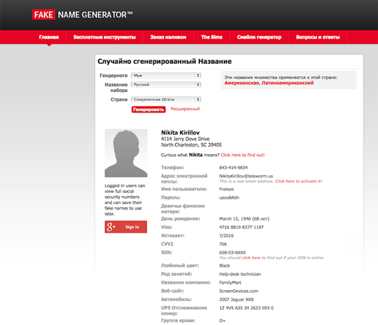 Сайт Fake Name Generator замечателен тем, что создаёт готовую виртуальную личность с массой самых различных данных, включая реалистично выглядящий адрес с индексом, телефонный номер, проходящий автоматизированные тесты на подлинность, род занятий, группу крови, реально работающий после активации e-mail, удовлетворяющие стандартам номера платёжных карт и социальной страховки, рост, вес, географические координаты, марку автомобиля и даже любимый цвет. Можно точно задать возраст и регион поддерживаемых службой стран.
