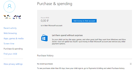 5. В разделе Purchase & spending вы можете добавить на счет своего ребенка деньги, которые он при желании израсходует на покупки в магазинах Windows или Xbox. В дальнейшем здесь будет показан список купленного им контента.