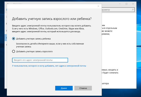 2. Выберите «Добавить учетную запись ребенка» и укажите адрес его электронной почты.