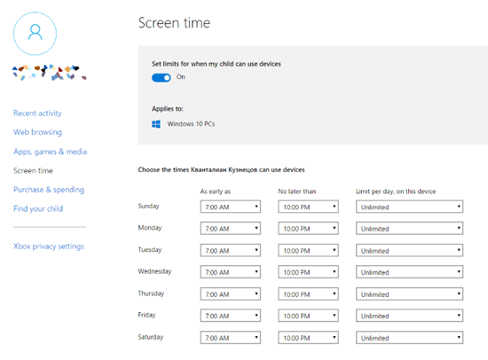 4. В разделе Screen time вы можете указать время, когда ребенку позволено пользоваться компьютером и максимальную длительность работы.