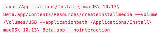 sudo /Applications/Install\ macOS\ 10.13\ Beta.app/Contents/Resources/createinstallmedia —volume /Volumes/USB —applicationpath /Applications/Install\ macOS\ 10.13\ Beta.app —nointeraction