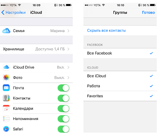 Наконец, берем в руки iPhone и проверяем, синхронизируются ли наши контакты через iCloud. Для этого заходим в раздел настроек iCloud и убеждаемся, что что напротив пункта «Контакты» включен зеленый ползунок.