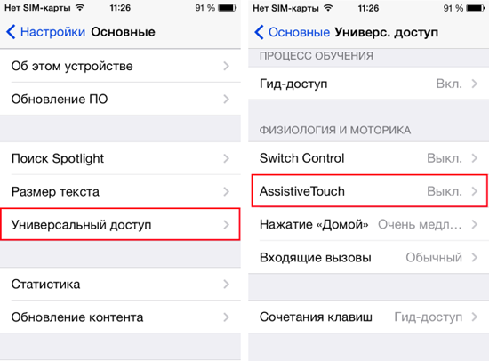 -Выбрать подпункты “Универсальный доступ” и “Assistive Touch”