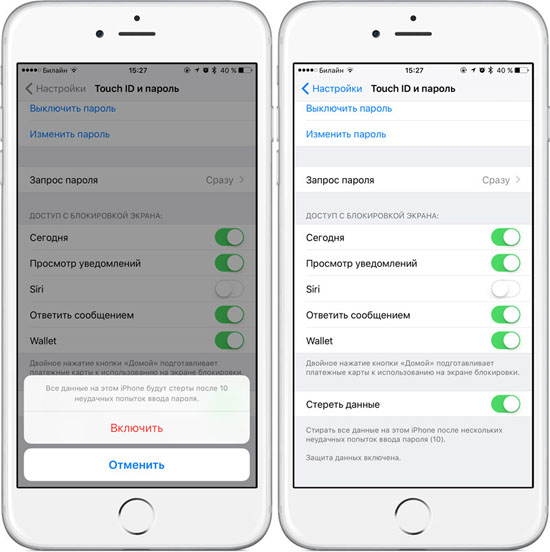 Чтобы убедиться, что iPhone надежно защищен от взлома, нужно перейти в настройки iOS, меню «Touch ID и пароль». Здесь следует активировать блокировку и поставить выключатель напротив «Стереть данные» в положение «Включено». В этом случае, все данные в памяти iPhone будут стерты после 10 неудачных попыток ввода пароля.