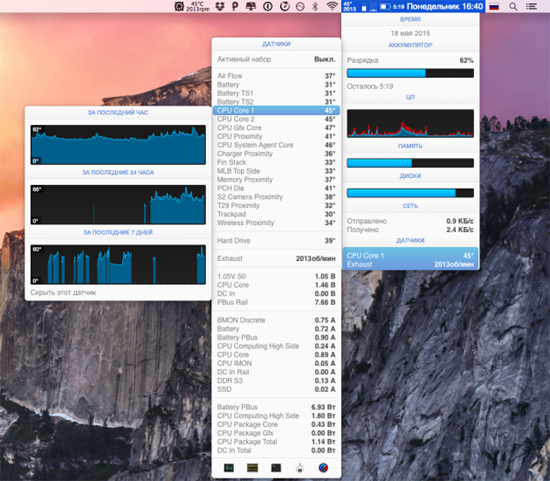 Одной из лучших профильных утилит является iStat Menus 5. Она предоставляет наиподробнейший мониторинг всех системных параметров, включая температуру со всех установленных датчиков. Дополнительно с ее помощью можно регулировать обороты кулеров, а также выяснить, какие приложения загружают процессор.