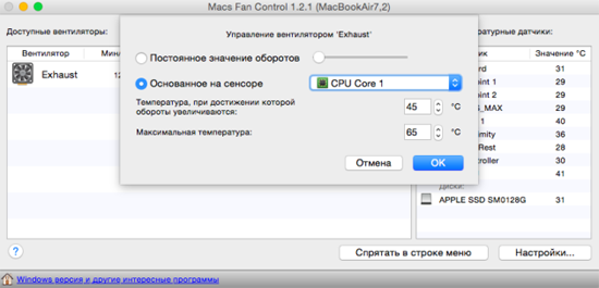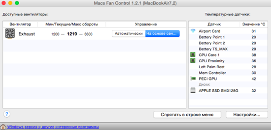 Компьютеры Apple работают с упором на комфорт использования, поэтому система охлаждения начинает активно работать при достижении уже относительно высоких температур. Обычно кулеров вообще не слышно до 70–75 °С, и только потом они начинают раскручиваться. Изменить такое поведение системы можно с помощью отличного бесплатного приложения Macs Fan Control.