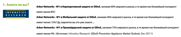 «Решение, которое предлагает компания Arbor, защищает от DDoS-атак не «по примеру пропуска через турникет», после чего идет обрезка опасного трафика, а технологически на другом уровне, где посессионный пропуск отсутствует, и возможность перенагрузки исключена. Принцип защиты построен так, что Arbor Pravail APS сначала пропускает трафик через себя, анализирует его и обрезает опасный, в результате чего сервер получает уже очищенный и безопасный трафик, и продолжает нормально функционировать, - рассказывает Владимир Гук. – Конечно, идеальных систем не бывает, и мы иногда сталкиваемся с, так называемыми, false-срабатываниями, когда урезается трафик, который не несет угрозы. Тем не менее, эффективность данной системы достаточно высока и, по уровню информационной безопасности, не имеет равных.