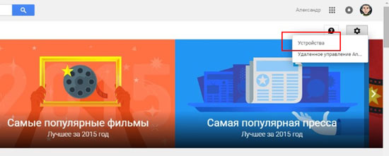 Для этого снова зайдите в веб-версию Google Play, нажмите на значок настроек в правой верхней части экрана и появившемся меню выберите «Устройства» (или сразу перейдите по этой ссылке).