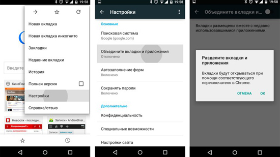 Как бы то ни было, многим пользователям это неудобно и хочется разделить список запущенных приложений и вкладки браузера. К счастью, в компании Google не стали лишать пользователей возможности отключить функцию отображения вкладок браузера в запущенных приложениях. Давайте разберемся, как это можно сделать, тем более что функция включена по умолчанию в Android Lollipop.