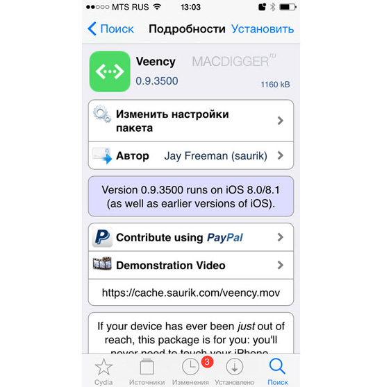 Шаг 3: Перейдите на вкладку Поиск, напишите в строке Veency и подтвердите установку твика.