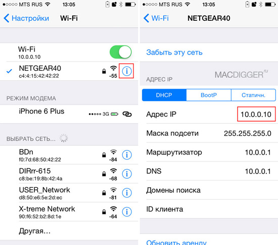 Шаг 4: Зайдите в настройки Wi-Fi и сделайте тап на кнопке «i» рядом с названием вашей беспроводной сети. Запомните IP-адрес устройства.