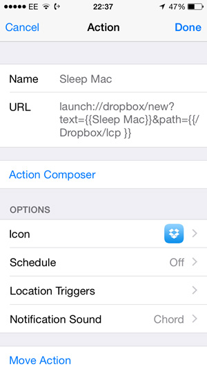 -Программа-лаунчер Launch Center Pro для iOS. Приложение дает возможность выполнять рутинные задачи максимально быстро — при помощи специальных иконок-шорткатов. Нужное для перехода Mac в режим сна действие — загрузка файлов в Dropbox;