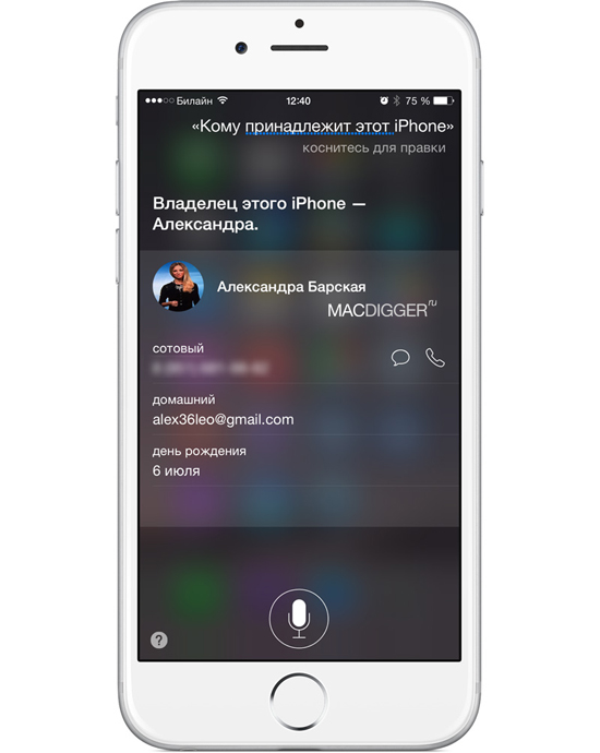 Для активации аккаунта мессенджера на другом устройстве пользователю нужно лишь узнать номер телефона «жертвы». Если эта информация неизвестна, пользователь может спросить об этом Siri при помощи фразы «Мой контакт» или «Кому принадлежит этот iPhone». В том случае, если владелец аппарата включил опцию, на экране смартфона высветится его контактная информация.