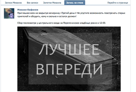 Наконец, еще один вариант посмертного обслуживания подготовили в российском PR-агентстве Irony Production. 13 мая они запустили услугу по ведению страниц умерших людей. Кроме привычной возможности удалить всю информацию или опубликовать заранее заготовленный текст, пользователь может доверить публикации на своей странице сотруднику агентства. Будущий мертвец может либо полностью довериться исполнителям, либо оговорить, в каком ключе должны быть новые записи от его имени (например, в юмористическом). Представители агентства заверили «Ленту.ру», что буквально за пару дней у новой услуги уже нашлось несколько заказчиков, готовых выложить несколько тысяч рублей за возможность продлить жизнь своим страничкам. Но вряд ли эта услуга будет пользоваться большим спросом: ценность чужих записей на странице умершего крайне сомнительна. Как, собственно, и этический аспект приложения.