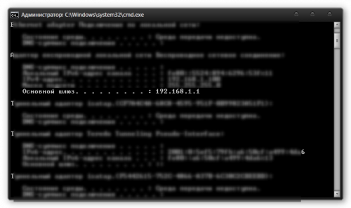 Если у вас другой адрес, то это легко можно узнать. Нажимаем сочетание клавиш Win+R, в появившемся окне вводим команду cmd. Открывается окно терминала, где нужно ввести команду ipconfig. Вот значение параметра Основной шлюз — это именно то, что нам и нужно.