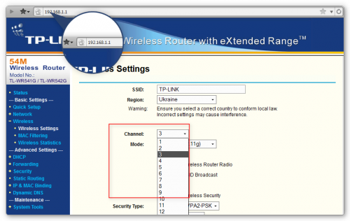 3. Теперь необходимо открыть настройки роутера и изменить канал. Для этого следует открыть в браузере панель управления своим устройством. Обычно для этого достаточно ввести в адресную строку браузера адрес 192.168.1.1.
