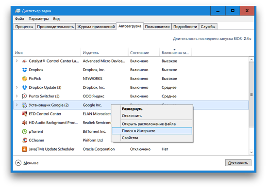 Выявите те программы, которые вам не очень нужны и которые более всего тормозят старт операционной системы. Щёлкните по ним правой кнопкой мыши и выберите пункт «Отключить». Если вы не очень ориентируетесь в назначении той или иной утилиты, то можно получить дополнительные сведения во всемирной сети Интернет. Для этого воспользуйтесь пунктом «Поиск в Интернете» в этом же контекстном меню.