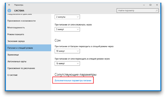 Откройте меню «Пуск» и выберите пункт «Параметры». В появившемся окне нажмите на кнопку «Система», а потом перейдите в раздел «Питание и спящий режим». Промотайте страницу в самый низ и перейдите по ссылке «Дополнительные параметры питания».