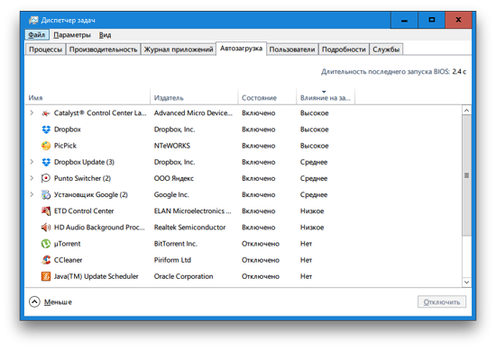 Операционная система Windows 10 содержит простой и удобный менеджер автозагрузки, который находится теперь в диспетчере задач. Для его запуска щёлкните правой кнопкой мыши по панели задач и выберите пункт «Диспетчер задач». Эта утилита содержит два вида отображения, переключение между которыми производится с помощью кнопки в левом нижнем углу «Подробнее».