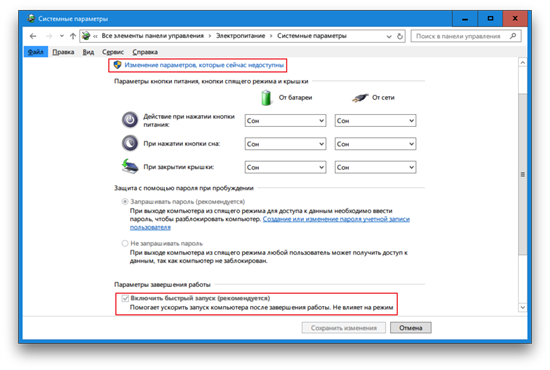 Перед вами появится окно старой панели управления. Найдите в левой панели ссылку «Действия кнопок питания» и щёлкните по ней. В этом разделе нас интересуют опции завершения работы, но не все из них доступны. Поэтому сначала требуется щёлкнуть по ссылке «Изменение параметров, которые сейчас недоступны» и только потом можно будет установить флажок возле опции «Включить быстрый запуск (рекомендуется)».