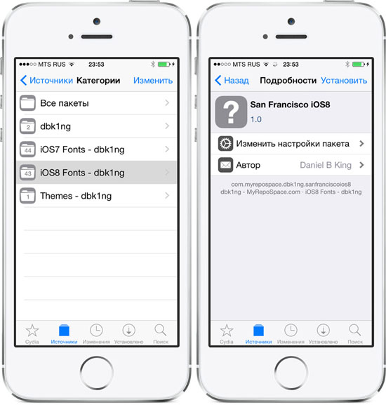 Шаг 3: В разделе Источники зайдите в репозиторий Dbk1ng, затем в секцию iOS8 Fonts и найдите в списке San Francisco iOS8. Подтвердите установку шрифта.