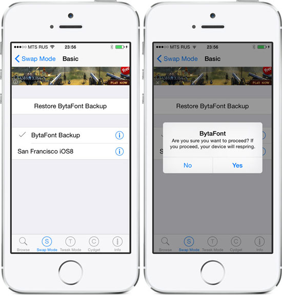 Следует отметить, что при установке утилита автоматически создает резервную копию системного шрифта. Поэтому если появится необходимость вернуться к заводской гельветике iOS 8, достаточно снова перейти на вкладку Basic и кликнуть «BytaFont Backup».