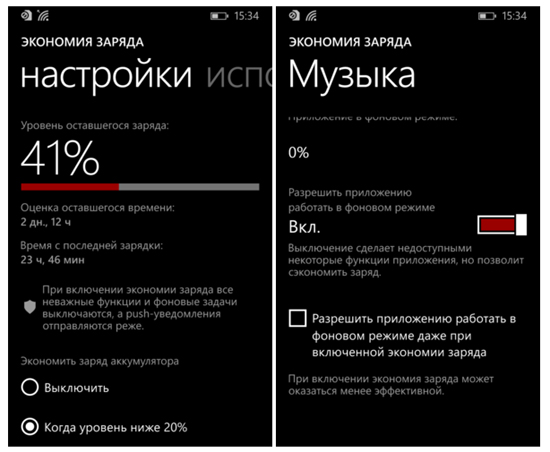 Прежде всего следует отметить специальную опцию «Экономия заряда». Найти ее можно в настройках системы. Пользователи смогут посмотреть уровень заряда аккумулятора и при желании настроить режим экономии. В последнем будет отключен ряд функций смартфона, среди которых автоматическое обновление календарей и почты, а также живых плиток. При этом владелец сможет по-прежнему принимать и отправлять звонки и SMS, пользоваться интернетом.