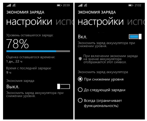 Кроме использования специального экономного режима в Windows Phone можно выполнить целый ряд дополнительных настроек для снижения потребления заряда батареи.