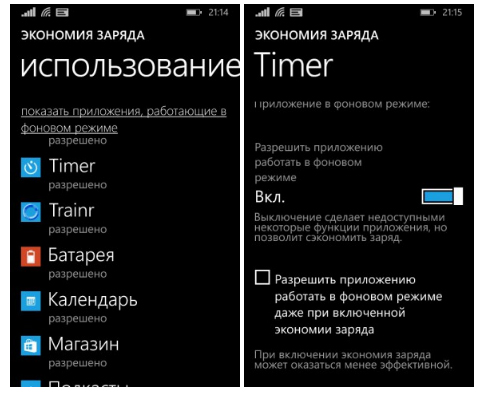 Не меньший интерес представляет и другой экран утилиты “Экономия заряда”, перейти в который можно выполнив свайп влево. Здесь перечислены те программы, которым разрешено работать в фоновом режиме. Рекомендуем хорошо изучить этот список и отключить ненужные вам элементы. Сделать это можно тапом по названию программы, после чего откроется экран дополнительных настроек энергопотребления. Здесь вы сможете запретить программе работать в фоновом режиме или, наоборот, позволить работать даже не взирая на активацию режима экономии.
