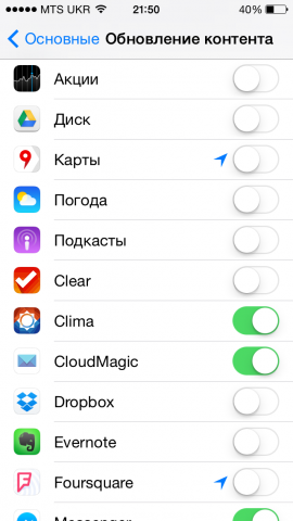 В iOS 7 добавилась возможность, которая позволяет приложениям обновляться даже в фоновом режиме. В большинстве случаев это полезно, однако некоторые приложения злоупотребляют такой возможностью и постоянно работают в фоне, потребляя драгоценный заряд аккумулятора.