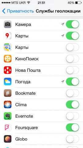 «Настройки => Приватность => Службы геолокации». Просмотрите список приложений, и отключите доступ к тем, в которых не нуждаетесь. Мы бы посоветовали оставить доступ к картам, погоде и камере, этого более чем достаточно.