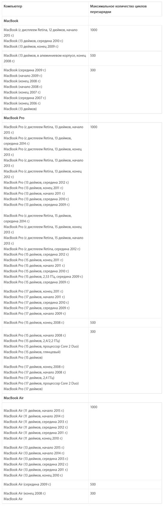 Сведения о максимальном количестве циклов перезарядки для аккумуляторов различных моделей MacBook, по истечении которых аккумулятор считается отработавшим ресурс, приведены в таблице ниже.