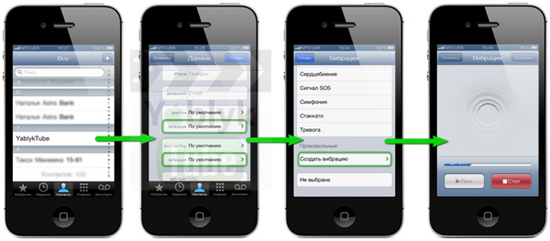 Теперь можно по звуку определить от кого исходит звонок или сообщение. Однако, иногда многие пользуются беззвучным режимом iPhone на совещании, встрече или паре паре в институте. В таком случае персональный рингтон бесполезен. Тут на помощь приходит Второй способ распознавания абонента — персональная вибрация. Для её настройки необходимо сделать следующее: