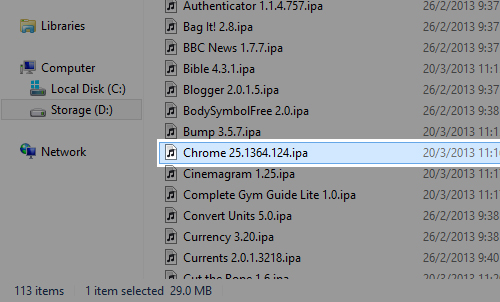 Если же у вас резервной копии с требуемой программой не осталось, тогда можно попросить помочь друга, у которого она есть. Он должен скопировать исполняемый файл с приложением и отправить его электронной почтой или любым другим способом вам. Расположение программы на диске можно узнать в iTunes. Для этого нужно щелкнуть на ней правой кнопкой и выбрать опцию «Показать в Проводнике». После этого откроется окно файлового менеджера, в котором отобразятся созданные резервные копии программ. Они носят расширение .ipa.