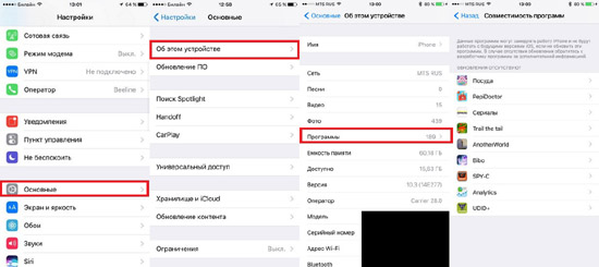 Для того чтобы вычислить такие приложения, необходимо перейти в «Настройки» — «Основные» — «Об этом устройстве» — «Программы». Это действие вызовет список ПО, в основу которого положена 32-битная разрядность и которое потенциально может замедлять работу вашего устройства.