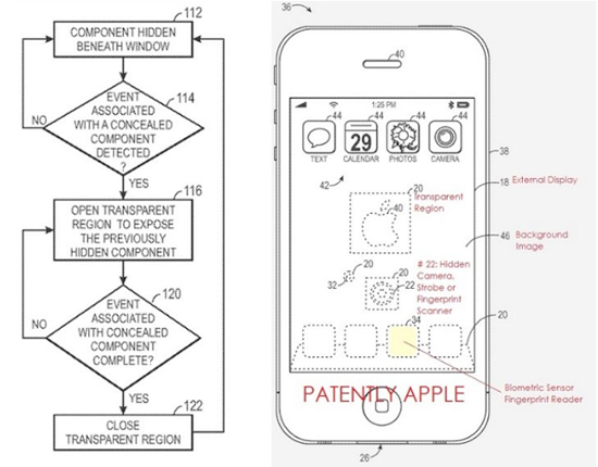 Один из патентов Apple, которые могут никогда не увидеть мир в готовом изобретении, описывает прозрачный дисплей, под которым прячутся камера, вспышка, микрофон и кнопка Home со сканером отпечатков пальцев.