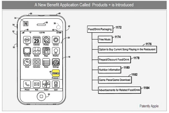 Патент на приложение «Products+» описывает технологию, которая будет сканировать товары, мимо которых проходит пользователь в супермаркете, выдавая их полную характеристику, состав и другие важные данные. Приложение может отслеживать действующие скидки, акции и специальные приложения и также оповещать о них пользователя.