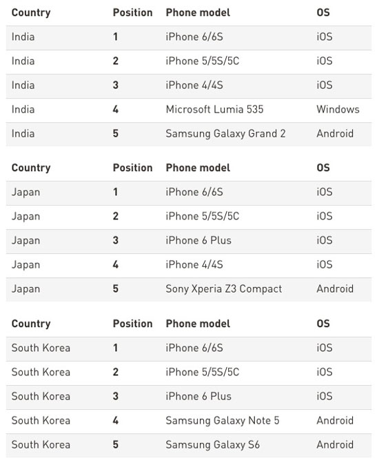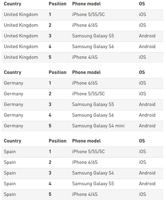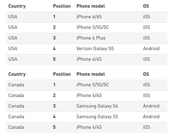 Как видите, первое и вторые места делят между собой iPhone 5/5s/5c и iPhone 6/6s. А где-то на пятой строчке до сих пор находится iPhone 4 (!) и iPhone 4s! Собственно, в Северной Америке картина точно такая же: