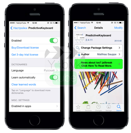 Теперь такой функционал можно установить на iPhone и iPad при помощи джейлбрейк-твика PredictiveKeyboard. Для начала следует активировать пробную трехдневную лицензию и скачать необходимые языки в настройках расширения. Среди большого количества языков нашлось место украинскому и русскому. После этого можно изменить такие параметры PredictiveKeyboard: