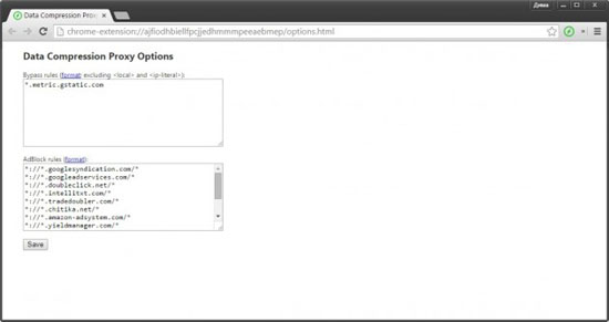 Кроме этого, в настройках расширения вы можете задать список сайтов, трафик с которых не будет сжиматься, а также список адресов, которые будут блокироваться прокси-сервером. Таким образом, скопировав сюда данные фильтра AdBlock, мы получаем ещё и отличный блокировщик рекламы.