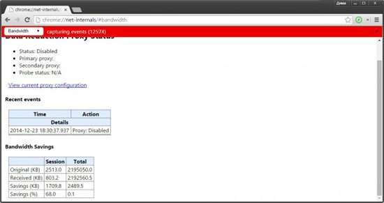 Для того чтобы проверить работу расширения, следует открыть служебную страницу браузера по адресу chrome://net-internals/#bandwidth. Здесь мы видим в таблице оригинальный размер страницы, её размер после сжатия и процент экономии трафика.