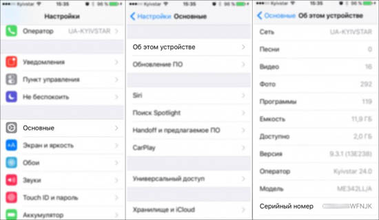 Сначала нужно узнать серийник нашего iPhone. Его можно посмотреть в настройках («Основные» → «Об этом устройстве»).