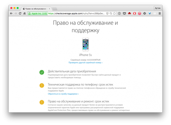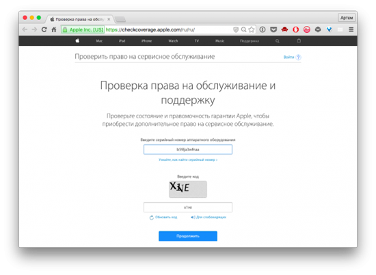 Теперь переходим на страницу проверки гарантии Apple, вводим серийник и проверочный код.