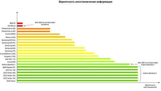 Предлагаю сегодня немного поговорить о восстановлении информации с неисправных SSD накопителей. Но для начала, прежде, чем мы познакомимся с технологией спасения драгоценных кило- мега- и гигабайт, прошу обратить внимание на приведенную диаграмму. На ней мы попытались расположить наиболее популярные модели SSD согласно вероятности успешного восстановления данных с них.
