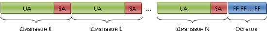 Единицей чтения и записи у микросхем памяти выступает единица, именуемая страницей. Для современных микросхем размер страницы равен приблизительно 8 КБ или 4 КБ. Причем это значение не является степенью двойки, а немного больше. Т. е. внутри страницы можно разместить 4 или 8 КБ пользовательских данных и еще что-нибудь. Эту избыточную часть накопители используют для хранения кодов коррекции и некоторых служебных данных. Обычно страница поделена на несколько диапазонов. Каждый диапазон состоит из области пользовательских данных (UA) и области служебных данных (SA). Последняя как раз и хранит внутри себя коды коррекции, которые защищают данный диапазон.