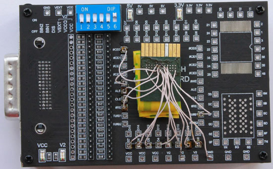 Трудности могут возникнуть еще на этапе считывания. Микросхемы NAND flash памяти выпускаются в разных корпусах, и для конкретной микросхемы в комплекте с программатором может не оказаться нужного адаптера. Для таких случаев в комплекте обычно есть некоторый универсальный адаптер под распайку. Инженер вынужден, используя тонкие проводки и паяльник, соединить нужные ножки микросхемы с соответствующими контактами адаптера. Задача вполне решаемая, но требует прямых рук, определенных навыков и времени. Сам то я с паяльником знаком не близко, поэтому такая работа вызывает уважение.