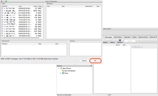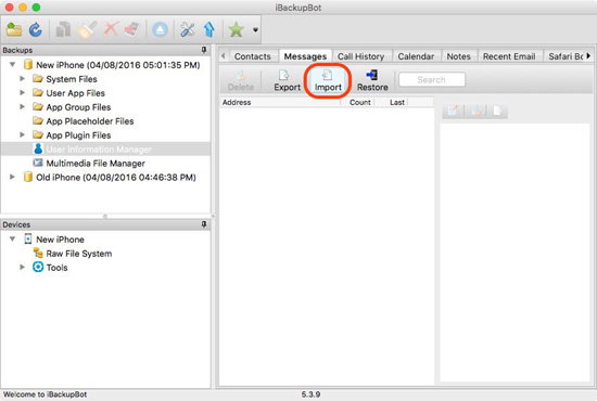 Шаг 4: Перейдите на вкладку Messages и нажмите Import. Выберите файл резервной копии, который вы создали во время выполнения первого шага и нажмите OK.
