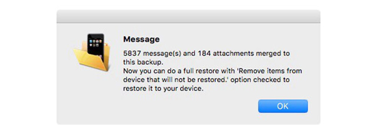 Шаг 7: Нажмите OK в диалоговом окне, свидетельствующем об объединении сообщений и вложений с резервной копией.