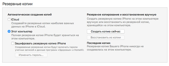 Убедитесь, что сохраняете копию на текущий компьютер и опция шифрования отключена. После создания бэкапа отсоедините iPhone. Вы можете восстановить сообщения как на текущий iPhone, так и на другой. Если вы хотите восстановить текстовые сообщения на текущее устройство, то после создания резервной копии выполните сброс к заводским настройкам. Если же сообщения будут переноситься на новое устройство, то активируйте его при первом включении.