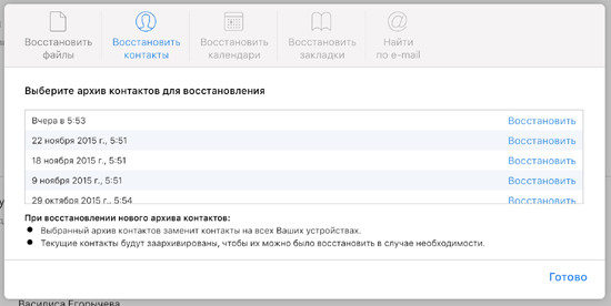 Так, например, можно восстановить контакты по состоянию на вчерашний день или даже прошлый месяц — в этом случае новый архив заменит контакты на всех устройствах, а текущие контакты будут заархивированы.
